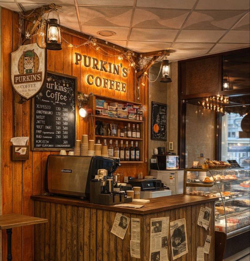 Кофейня «Пуркин» — это продолжение той же философии, но в другом ритме. Это пространство для утра, дневной паузы или неспешного разговора. Хороший кофе, спокойная атмосфера, внимание к деталям и ощущение уюта, которое не зависит от времени суток.
